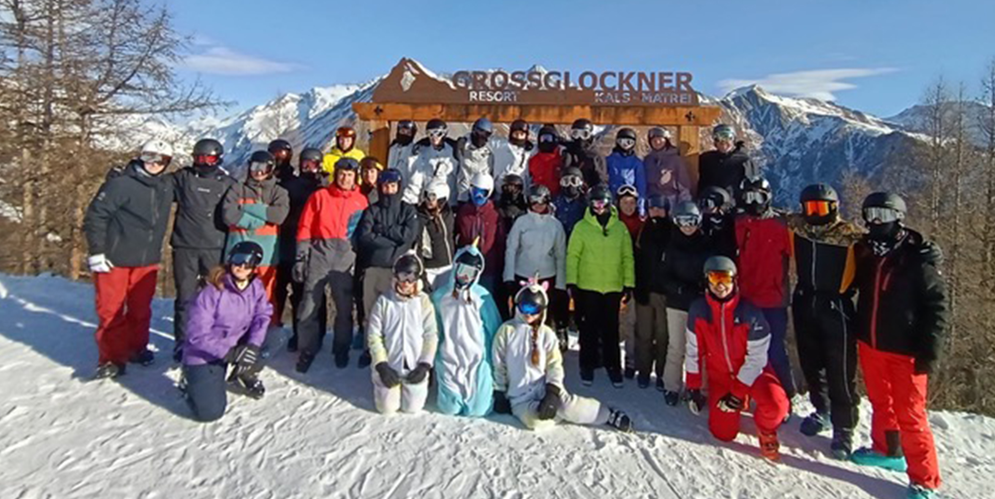 Nach einer rund zwölfstündigen Nachtfahrt lieferte uns ein herrlicher Sonnenaufgang über der alpinen Berglandschaft bereits einen Vorgeschmack auf die kommenden Tage. Begleitet von Après-Ski-Hits aus der Musikbox ließ er somit mengelnden Schlaf im Bus schnell vergessen. Nach einem ersten Frühstück liehen wir unser Equipement aus, besorgten unsere Liftpässe und bezogen unsere Mehrbettzimmer im Gasthof Lublass, Unterkunft für die kommenden sieben Nächte, der exklusiv für uns reserviert war. Ab Tag 2 wurden im Großglockner-Resort Matrei-Kals sowohl Anfänger:innen als auch erfahrene Fahrer:innen in leistungshomogenen Gruppen konditionell, technisch und kognitiv gefordert. Das tägliche Highlight stellte die gemeinsame Talabfahrt aller Bereitwilligen dar. Nach mehrstündigem Training auf der Piste verbrachten wir auch den Rest des Tages gemeinsam. Abendessen, Theorieunterricht und Gesellschaftsspiele brachten die Kursteilnehmenden zusammen an den Tisch, wobei insbesondere das gemeinsame Singen für Begeisterung sorgte. Neben jeglicher Freude stand allerdings der Leistungsgedanke stets im Vordergrund, schließlich galt es die Praxis- und Theorieprüfung möglichst erfolgreich zu meistern.