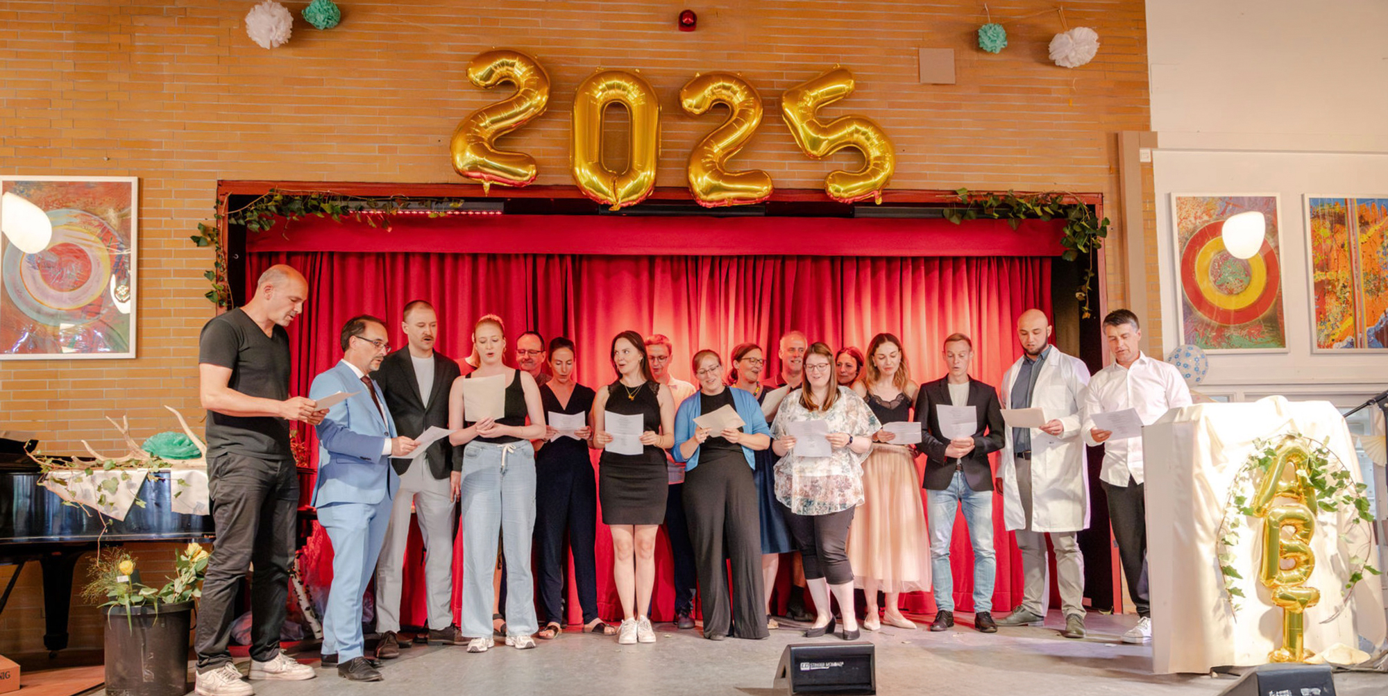 Festlich ging es zu: Eine ausgeschmückte Mensa, Catering auf der Terrasse bei herrlichem Sonnenschein und ein respektabler „Ohrenschmaus“ durch die Lehrinnen und Lehrer – da flossen dann auch einige Tränchen.